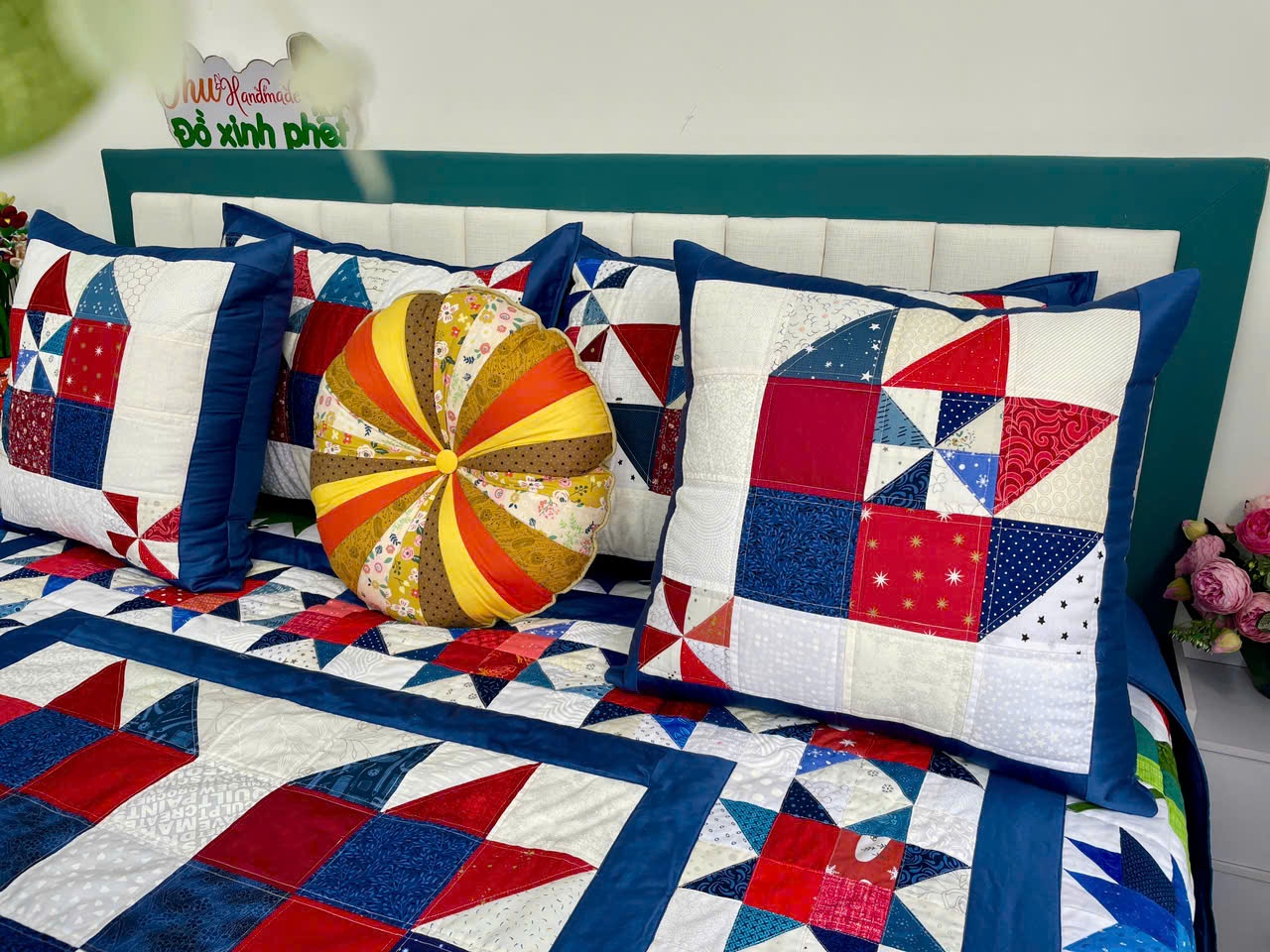 Tất cả những màu, sắc, hoạ tiết kể trên được HQQuilt bố cục trên một nền xanh cobal hoàn toàn nhất quán, xuyên suốt toàn bộ Bộ sưu tập, Bộ sản phẩm làm nên cái hồn, cốt căn bản cuả Happy Quilt.