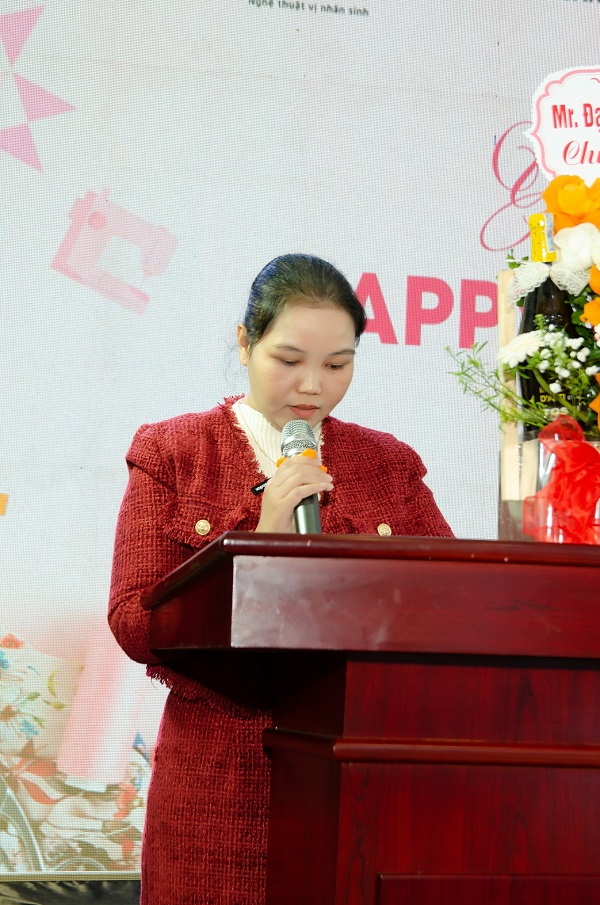 (Mrs. Vũ Thị Cúc - Quản đốc xưởng sản xuất, đại diện cán bộ công nhân viên lên phát biểu ý kiến và chúc Tết)