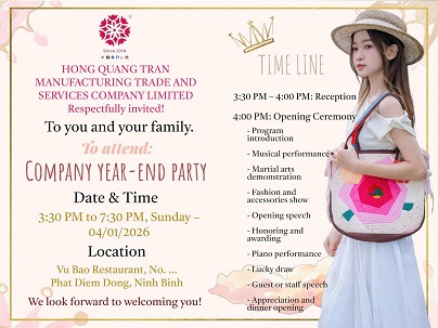 Công ty TNHH Sản xuất Thương mại và Dịch vụ Hồng Quang Trần xin gửi lời cảm ơn chân thành tới toàn thể cán bộ công nhân viên, quý đối tác và khách mời đã luôn đồng hành, tin tưởng và đóng góp vào sự phát triển của công ty trong suốt năm vừa qua.