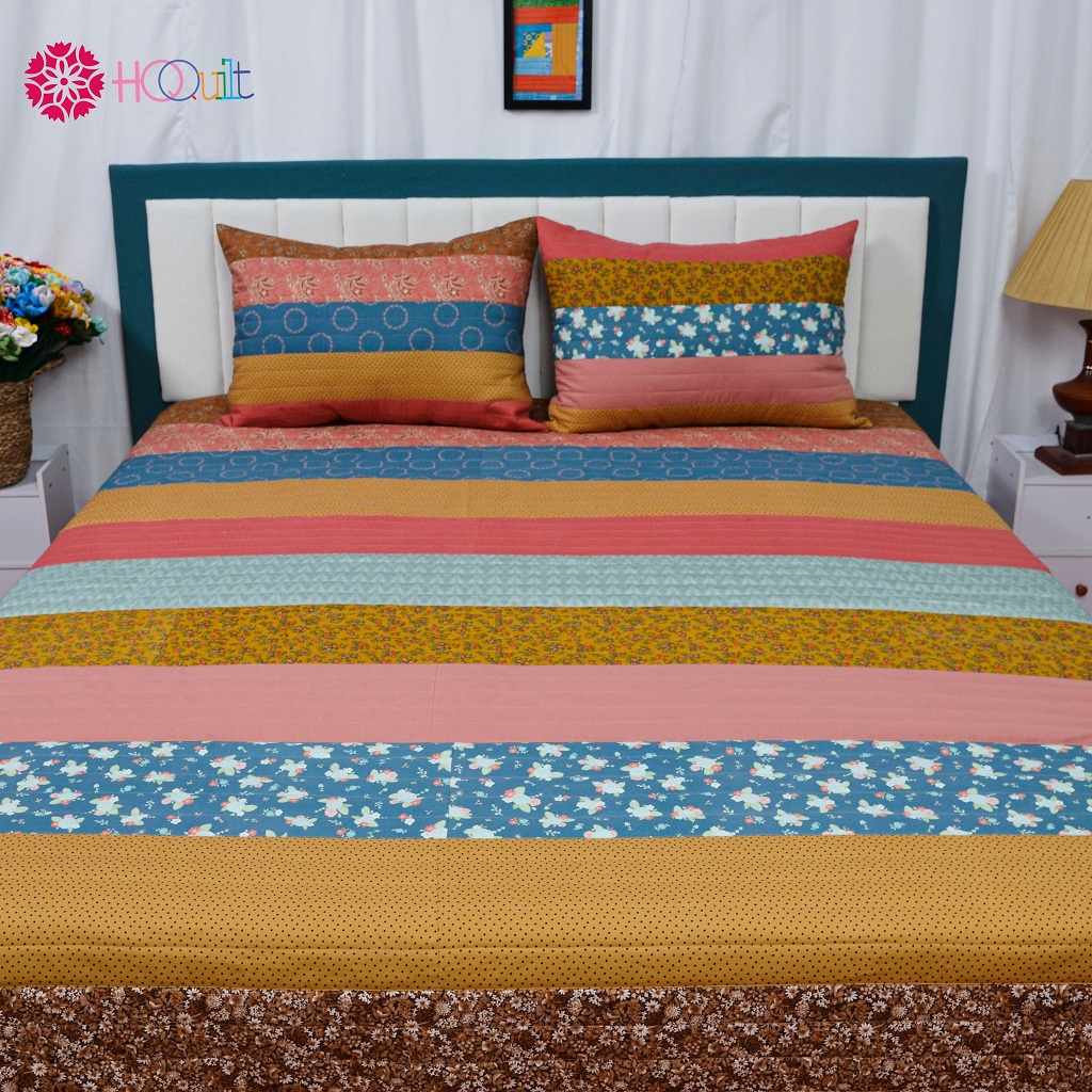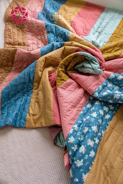 Lấy cảm hứng từ những gam màu đặc trưng của cung điện cố đô — sắc đỏ ngói rêu phong, màu gỗ sơn son phai mờ theo năm tháng, xanh gốm cổ thanh khiết, nâu đất tường thành vững chãi cùng vàng thư dịu dàng — HQQuilt đã sáng tạo nên Chăn Huế, một mẫu chăn ghép dải (strip quilt) vừa giữ được vẻ cổ kính vừa mang nét dịu dàng tao nhã, như một khúc nhạc cổ điển ngân vang giữa guồng quay hiện đại.