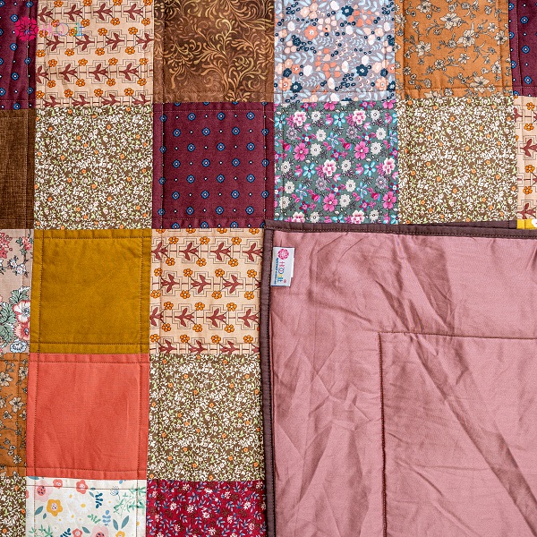 Chăn Quilt nâu cổ điển được ghép với bố cục hình vuông cùng các tone màu trầm, sáng khác nhưng vẫn tương hợp nhau. Từng mảnh họa tiết caro, hoa nhí, màu sắc được phối tự do nhưng nhìn tổng thể như 1 bản nhạc rực rỡ với từng nốt thăng trầm hài hòa.