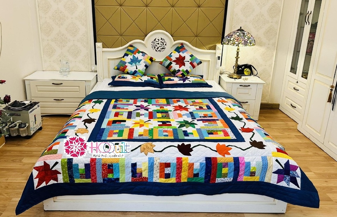 Chăn Quilt Lá Phong - Với họa tiết chủ đạo là những chiếc lá phong nhiều sắc thái. HQQuilt đã tạo ra 1 tấm chăn bằng sự kết hợp nhiều hình thức quilt khác khau.