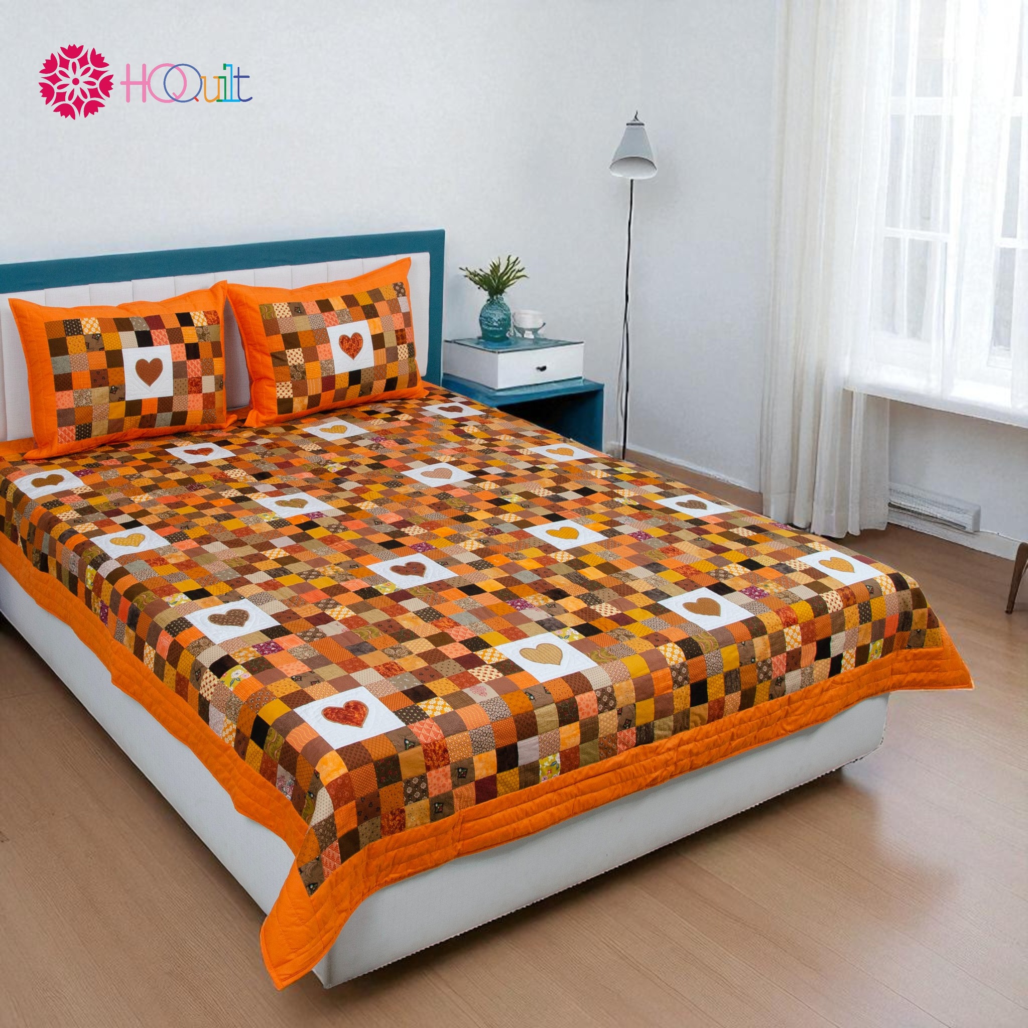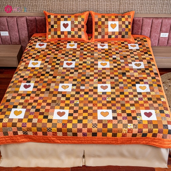 Chăn có màu nâu vàng ấm áp, gợi nhớ đến sắc màu của lá thu rơi. Kỹ thuật chần tự do quanh các hình trái tim giúp tạo ra độ nổi, đem lại cảm giác ba chiều sống động cho sản phẩm. Đồng thời, đường chần mí tỉ mỉ theo các đường ghép tạo nên sự đồng đều, hài hòa, giúp sản phẩm giữ được hình dáng và độ bền lâu dài.