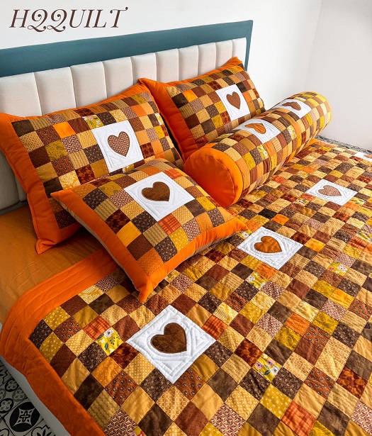 Chăn có màu nâu vàng ấm áp, gợi nhớ đến sắc màu của lá thu rơi. Kỹ thuật chần tự do quanh các hình trái tim giúp tạo ra độ nổi, đem lại cảm giác ba chiều sống động cho sản phẩm. Đồng thời, đường chần mí tỉ mỉ theo các đường ghép tạo nên sự đồng đều, hài hòa, giúp sản phẩm giữ được hình dáng và độ bền lâu dài.