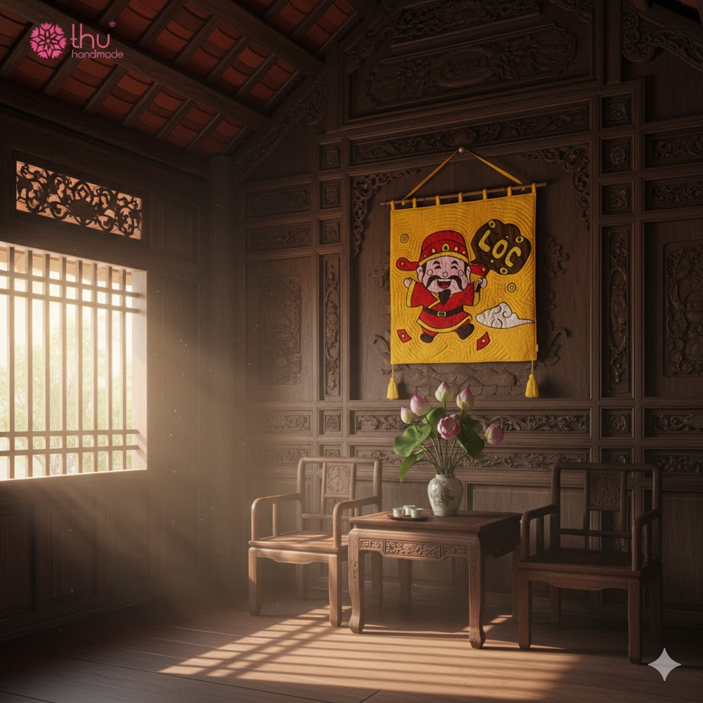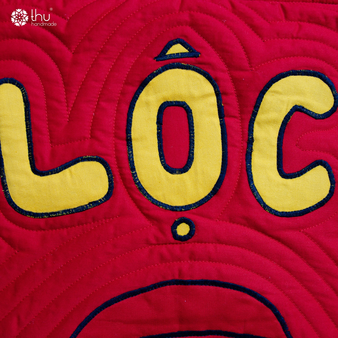 Tác phẩm được thực hiện bằng nghệ thuật quilting – quilt áp vải, nơi từng chi tiết Thần Tài và chữ Lộc được áp vải thủ công tỉ mỉ, sau đó chần bông bằng máy may với kỹ thuật chần tự do. Những đường chần dày, đều và có chủ ý tạo nên hiệu ứng nổi khối mềm mại, giúp hình ảnh trở nên sống động, có chiều sâu và giàu cảm xúc hơn tranh phẳng thông thường.